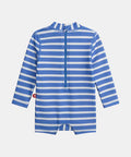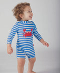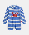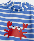 A UPF 50+ striped swimsuit, with a crab pattern and a back zip, to protect baby boy all summer.