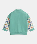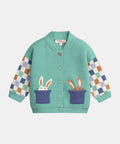 This cardigan wraps your baby in softness and warmth on chilly days. Its soft fabric and comfortable cut offer freedom of movement and light warmth. The plain gray body, checked sleeves, and neat ribbed edges give it a modern look, while the hat-effect pockets with rabbits add a playful touch. Practical, it opens fully with metal snaps for easy dressing, even with an active baby.