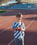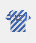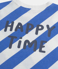 Designed for boys, this ecru and blue striped T-shirt is ideal for sunny days. Its soft cotton fabric and short sleeves ensure comfort throughout the day. The striped print and "Happy Time" inscription on the back add a fresh and casual touch.