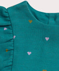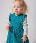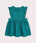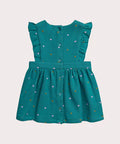 This peacock blue dress in jacquard cotton is perfect for baby girls on mild spring and summer days. Its ruffled chasuble cut ensures lightness and freedom of movement. The buttoned opening in the middle of the back and the little heart animation add a tender, elegant touch.