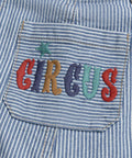 Elevate your baby's wardrobe with these striped overalls that combine style and comfort for your little one. Made from soft, durable cotton denim, they move with your child. The classic striped pattern and "CIRCUS" embroidery on the pocket add a chic and playful touch. Practical, adjustable straps and multiple openings make dressing and changing easy every day.