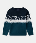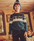 Designed for chilly days, this sweater keeps kids warm. Its wool knit and ribbed edges ensure comfort. Its three-tone jacquard and Viking motifs give it a Nordic feel.