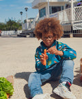 This blue fleece-lined sweatshirt is perfect for keeping kids warm on chilly days. Its soft, thick fabric ensures comfort and warmth every day. The forest animal print and kangaroo pocket add a playful, practical touch to this garment.