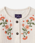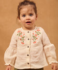 For a delicate child, perfect for mid-season. Soft cotton and a buttoned cut structure the silhouette. Coral and khaki embroidery give it an artisanal charm.