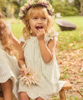 This elegant and charming dress is perfect for the warm season. Made from striped fabric, it features a flowing silhouette with a practical closure. Embroidery details and the matching bloomer create a refined ceremonial style.