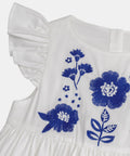 Designed for girls, this off-white cotton dress is ideal for warm weather and everyday occasions. Its buttoned back opening and short sleeves ensure optimal comfort and easy dressing. Blue floral embroidery on the bust and bottom of the dress adds a delicate and elegant touch to the style.