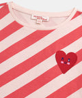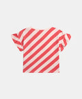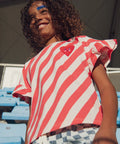Designed for girls, this red striped cotton T-shirt is ideal for sunny days. Its soft fabric and short ruffled sleeves offer comfort and lightness for everyday wear. The striped print and heart badge on the chest add a delicate and cheerful touch.