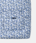 Sky blue and navy floral print on an ecru background