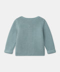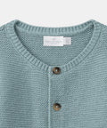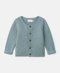For curious babies, ideal for spring mornings. Cardigan made from cotton and wool, fully front opening with buttons. Soft gray-blue, classic and comfortable look.
