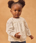 For adventurous girls in the spring, perfect for mild days. Cream blouse made of lightweight cotton, loose fit for freedom of movement. Delicate embroidery and button opening at the back, tender and refined style.