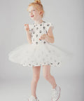 Designed for girls, this ecru dress is ideal for warm weather and summer occasions. Made from cotton with a tulle petticoat, it has a lightweight cut with short sleeves that are comfortable to wear. Its delicate floral print and combination of materials give it a soft, refined style.
