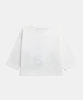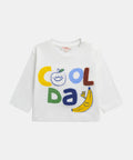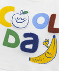 This long-sleeved cotton T-shirt combines softness and comfort for mid-season days. Its supple, breathable, and carbonized fabric protects little ones' sensitive skin while providing good insulation. The large graphic design with stylized fruit and the message "COOL DAY" on an ecru background adds a playful and vibrant touch, and the snap closure at the shoulder makes it easy to dress even an active baby.
