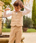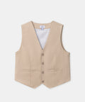 This chic and polished sleeveless vest is perfect for mid-season occasions. Made from beige twill with a soft lining, it offers a structured yet comfortable fit. Front pockets and striped lining add a refined, ceremonial touch.