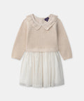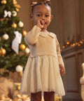 Perfect for little girls at winter parties, this dress combines comfort and elegance. Its knit top with gold thread and sequined tulle bottom create a refined contrast. The buttoned back opening makes dressing easy.