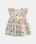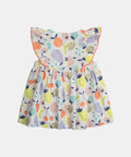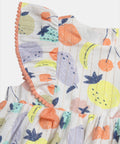 This fruit print dress combines softness, comfort, and charm for sunny days. Made from lightweight, breathable fabrics, it is gentle on your baby's sensitive skin. The gathered waist and ruffles at the shoulders add a delicate touch, while the back opening makes dressing easy. The contrasting apricot pompom trim adds a fashionable and refined detail.