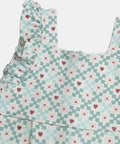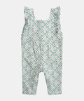 This cotton jumpsuit combines lightness, comfort, and softness for summer. Its exclusive powder blue print with small hearts and gingham-style flowers adds a tender and charming touch. The ruffled straps reinforce its delicate style, while the buttons at the back and snaps at the crotch make it easy to dress, even with an energetic baby.