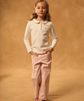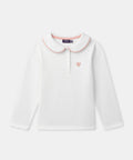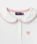 For a child with a soft style, perfect for mid-season. The cream jersey moves comfortably with her. The contrasting Peter Pan collar and heart embroidery add an elegant touch.