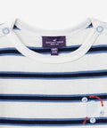 Perfect for curious babies in spring and summer, this ribbed striped bodysuit provides comfort and softness. Snap closures at shoulders and crotch for easy dressing. Blue and navy stripes with tennis print add style and a sporty feel.