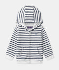 For active and adventurous boys, ideal for spring. Soft cotton hoodie with full zipper. Navy blue stripes and dog embroidery, relaxed and fun style.