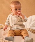 For little explorers, perfect for spring. Striped top and interlock pants, back opening, and elastic waistband. Printed farm animals and matching bib, a tender and pastoral universe.