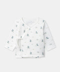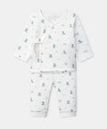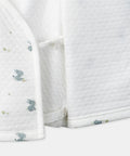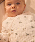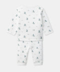 For little explorers, perfect for the spring season. Top and pants made of jersey, crossover opening reminiscent of a bodice with an elastic waistband. Printed with donkeys and farm animals, a tender rural universe.