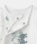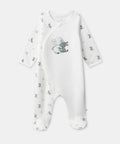 For little explorers, ideal for spring days. Velvet made with organic cotton, front and inseam opening with snap buttons. Donkey patches and farmer prints in gray-blue on a cream background, country and tender vibe.