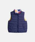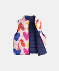 This reversible sleeveless pink jacket offers two looks in one. One side with a heart print and the other in plain navy to suit all occasions. The front pockets and zipped opening add comfort and practicality for baby.