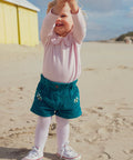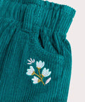 These peacock blue corduroy shorts are ideal for baby girls on cool spring and autumn days. Its soft fabric offers comfort and warmth while remaining lightweight. Flower embroidery under the pockets adds a delicate feminine touch to this basic.