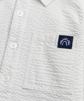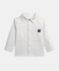 Designed for boys, this off-white cotton shirt is ideal for mid-season and cooler days. Its textured fabric, long sleeves, and buttoned front and cuffs make it comfortable and smart to wear. The two front pockets, one of which features a "Good Vibes Only" label, add a casual, modern touch.